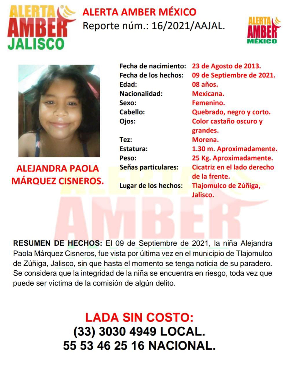 Alejandra trae el cabello corto, es morena, mide 1.30 metros de altura y tiene una cicatriz en el lado derecho de la frente.