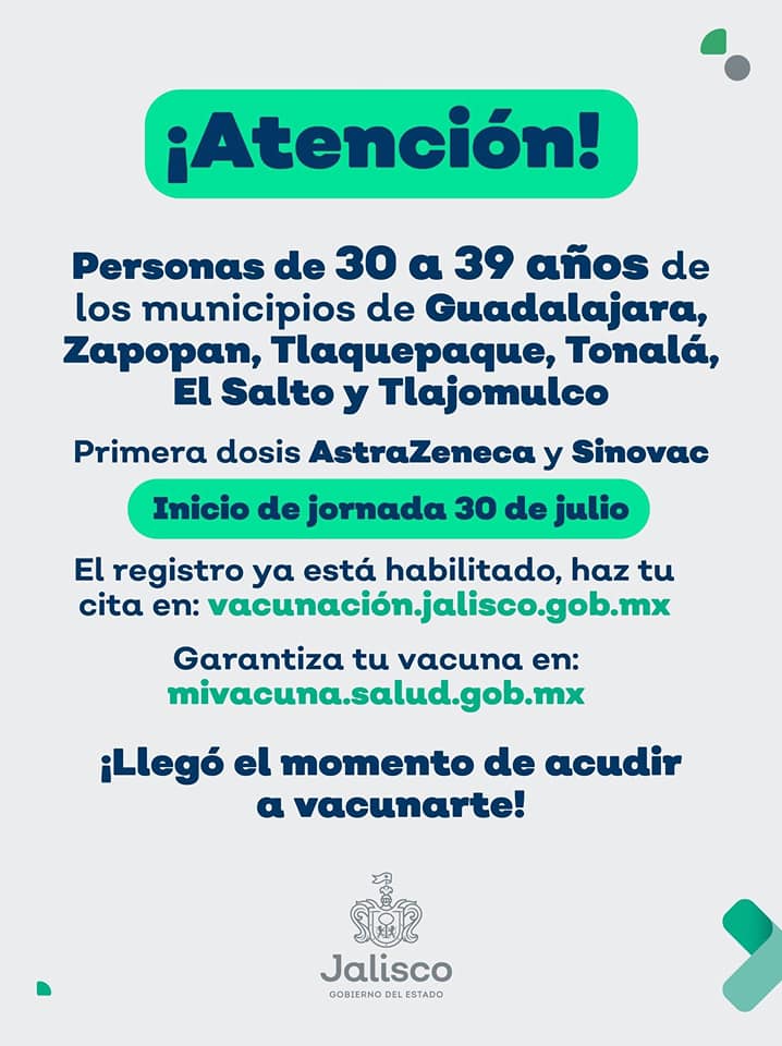 Los adultos de 30 años y más ya pueden tramitar cita para vacunarse contra covid-19 en Guadalajara, Zapopan, Tlaquepaque, Tonalá, Tlajomulco y El Salto.