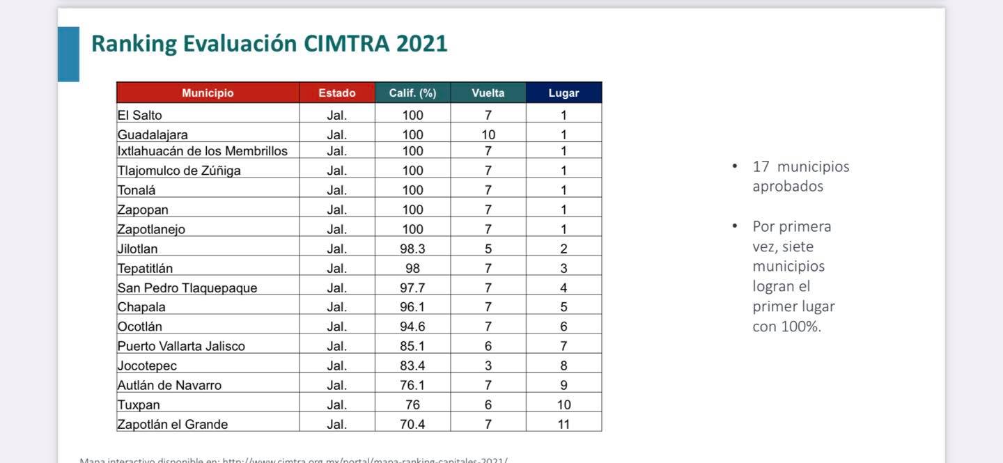 CIMTRA califica al Gobierno Municipal de El Salto y Zapotlanejo con 100