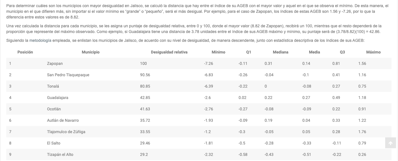 En contraste, el municipio menos desigual es Bolaños, pero su nivel se encuentra muy por debajo de la media estatal de desarrollo con un valor de -0.23 tanto en el ageb más alto como en el más alto y en el promedio.