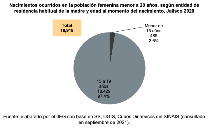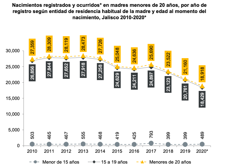 De acuerdo con los registros de nacimientos de Secretaría de Salud, durante 2020 ocurrieron 120 mil 704 nacimientos de madres residentes de Jalisco; de ellos, el 15.7% (18,918) eran de madres niñas y adolescentes menores de 20 años.