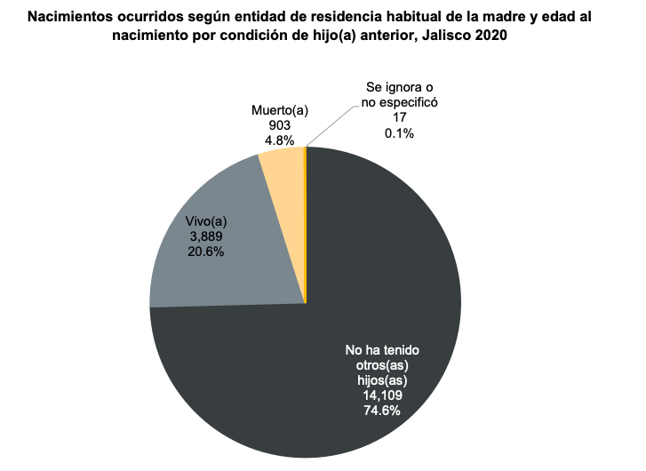 Destaca que, de ese monto total de nacimientos, en el 20.6% (3,889) de los casos, es decir, uno de cada 5, las madres declararon haber tenido con anterioridad un hijo(a) nacido(a) vivo(a), lo que significa que al menos eran madres por segunda vez. Por su parte, el 4.8% (903) señaló que había tenido algún hijo(a) muerto(a) y el 74.6% (14,109) mencionó que no tenía otros hijos(as).