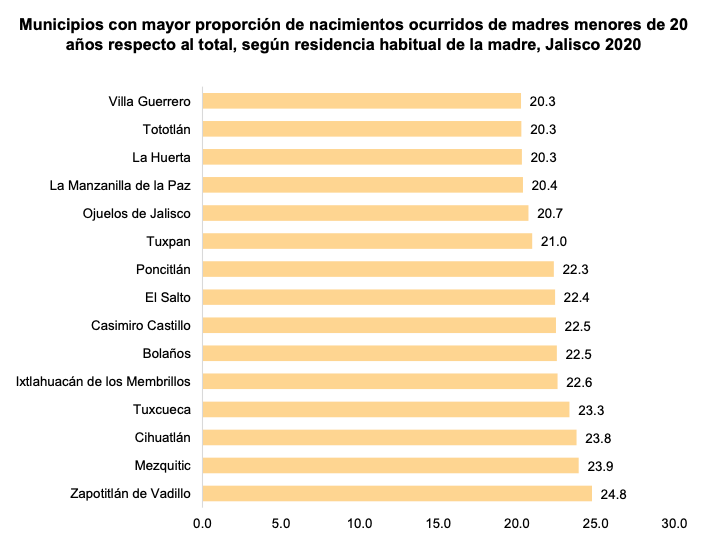 Al analizar las municipalidades según el porcentaje de nacimientos en madres menores de 20 años, respecto a los nacimientos totales de mujeres residentes del municipio, se observa que, en 2020, Zapotitlán de Vadillo tuvo la mayor proporción, con un 24.8% de los nacimientos ocurridos ese año, donde prácticamente 1 de cada 4 nacimientos fueron de madres adolescentes; le siguió Mezquitic con el 23.9%, Cihuatlán con 23.8%, Tuxcueca con 23.3% e Ixtlahuacán de los Membrillos con 22.6%.