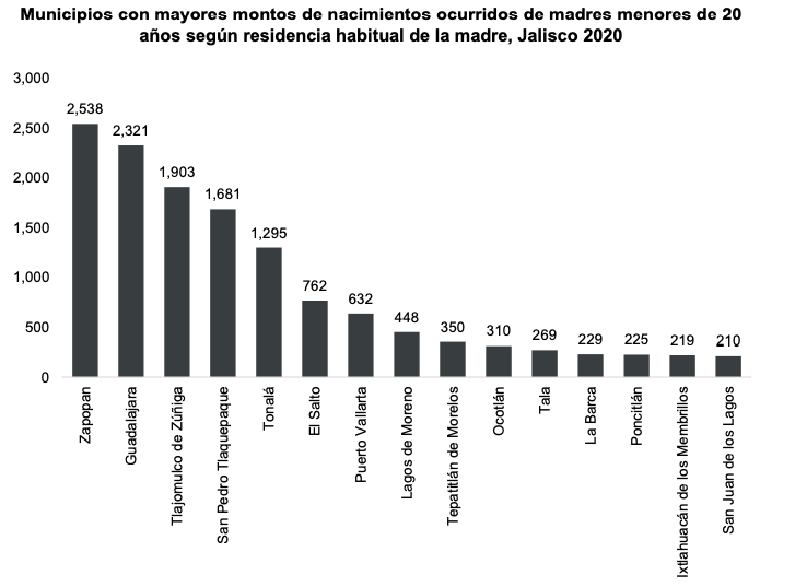 En lo que se refiere al embarazo adolescente en los municipios, en 2020 Zapopan presentó el mayor monto de nacimientos de madres menores de 20 años, con un total de 2 mil 538; seguido de Guadalajara con 2 mil 321 y Tlajomulco de Zúñiga con 1 mil 903. Estos tres municipios concentraron el 35.7% de los nacimientos en madres adolescentes del estado.