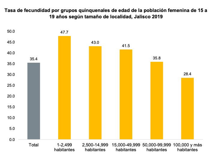 Finalmente, conforme a estimaciones con base en el Censo de Población y Vivienda 2020, durante 2019 la tasa de fecundidad adolescente en Jalisco fue de 35.4 nacimientos en madres de 15 a 19 años, por cada mil mujeres del grupo de edad. Destaca que la fecundidad adolescente fue mayor en las localidades rurales del estado, es decir, aquellas con menos de 2,500 habitantes, donde la tasa fue de 47.7 nacimientos por cada mil mujeres de 15 a 19 años; en aquellas localidades de 2,500 a 14,999 este valor fue de 43.0 y de 41.5 en las de 15 mil a 49,999 habitantes. Por su parte, la tasa más baja se registró en las localidades de 100 mil o más habitantes, con 28.4 nacimientos por cada mil mujeres adolescentes, seguido de una tasa de fecundidad adolescente de 35.8 en las localidades con población de 50 mil a 99,999.