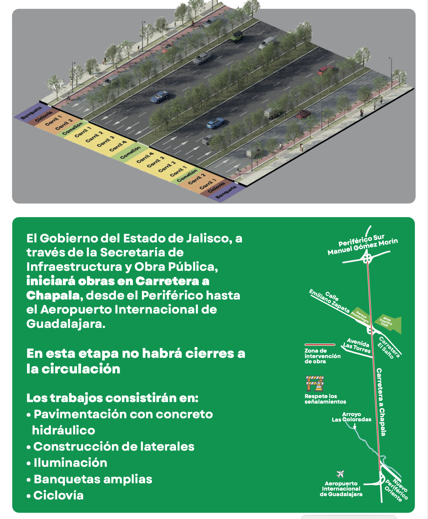 El Gobierno de Jalisco, a través de la Secretaría de Infraestructura y Obra Pública (SIOP), iniciará este lunes los trabajos de transformación urbana de la carretera a Chapala —del Aeropuerto Internacional de Guadalajara al Anillo Periférico Manuel Gómez Morín—, abarcarán los municipios de Tlaquepaque, Tlajomulco de Zúñiga y El Salto.