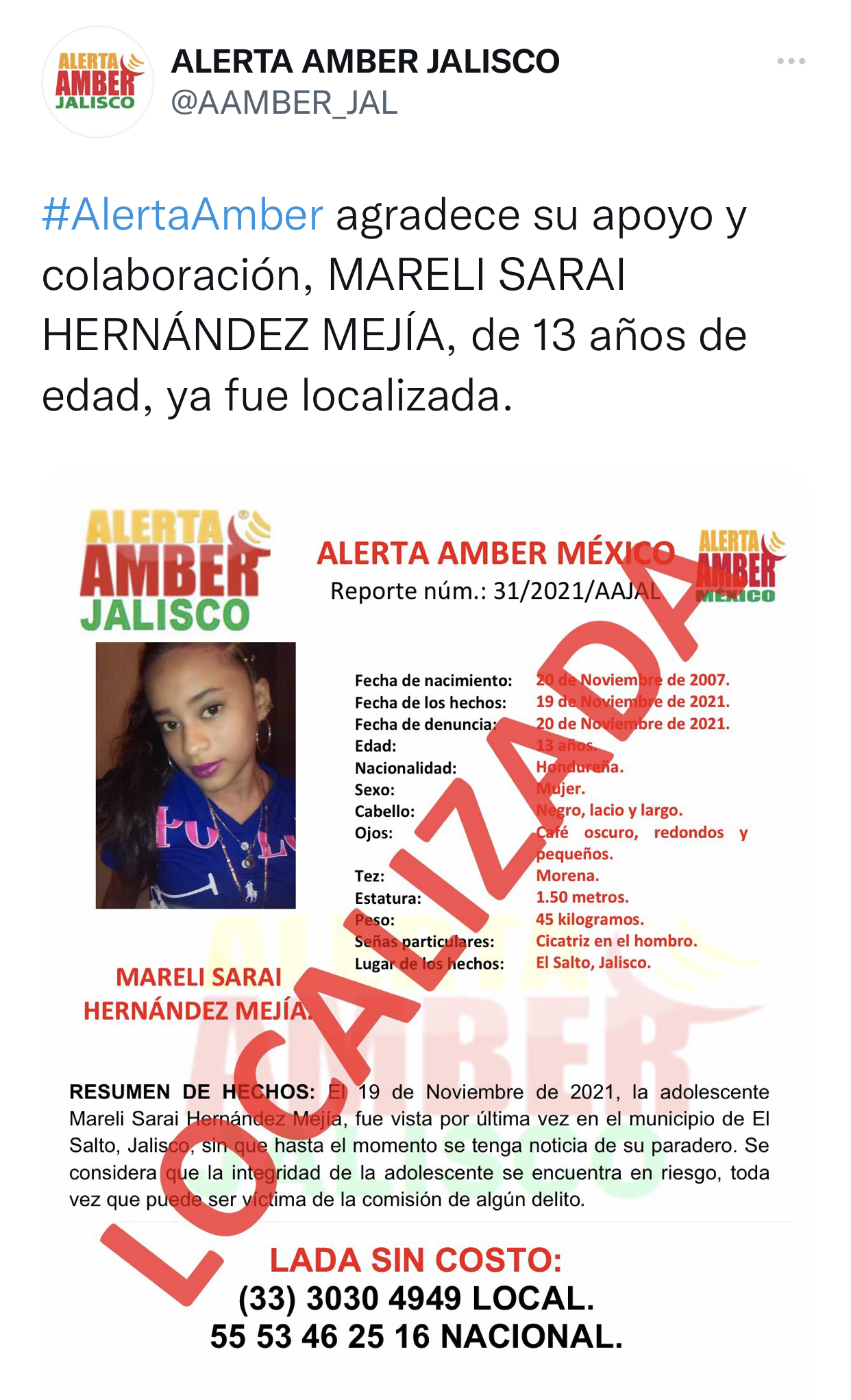 La adolescente de origen hondureño, Mareli Sarai Hernández Mejía ya fue localizada y se encuentra en buen estado de salud.