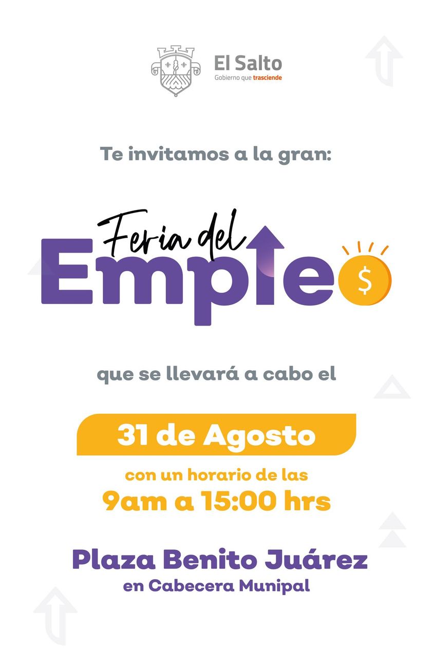 El Gobierno Municipal de El Salto invita a toda la población a la Feria del Empleo 2021 que se llevara a cabo el martes 31 de agosto de 9:00 a 15:00 horas en la Plaza Benito Juárez de la Cabecera Municipal.