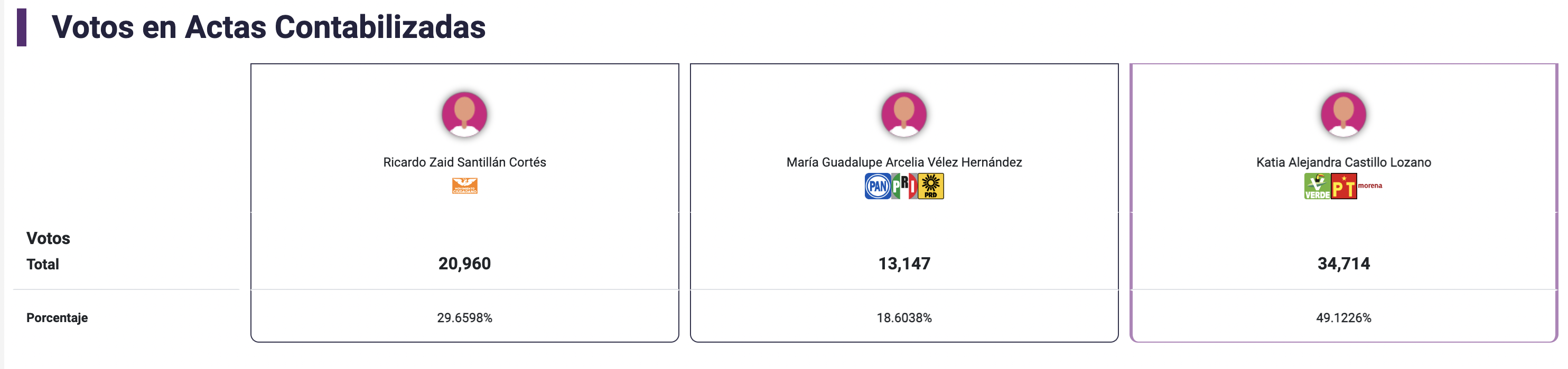 Con el 48 por ciento de las actas computadas, la oriunda de la Cabecera Municipal de El Salto suma el 49% de los votos.
