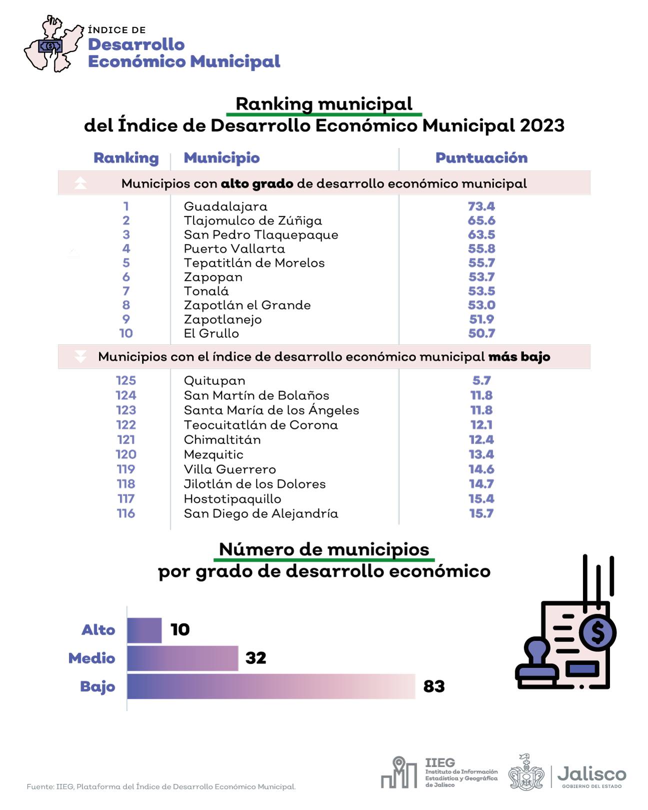 Según la información de la plataforma, en Jalisco hay 10 municipios con un IDEM de alto grado de desarrollo económico, 32 con medio y 83 con bajo.