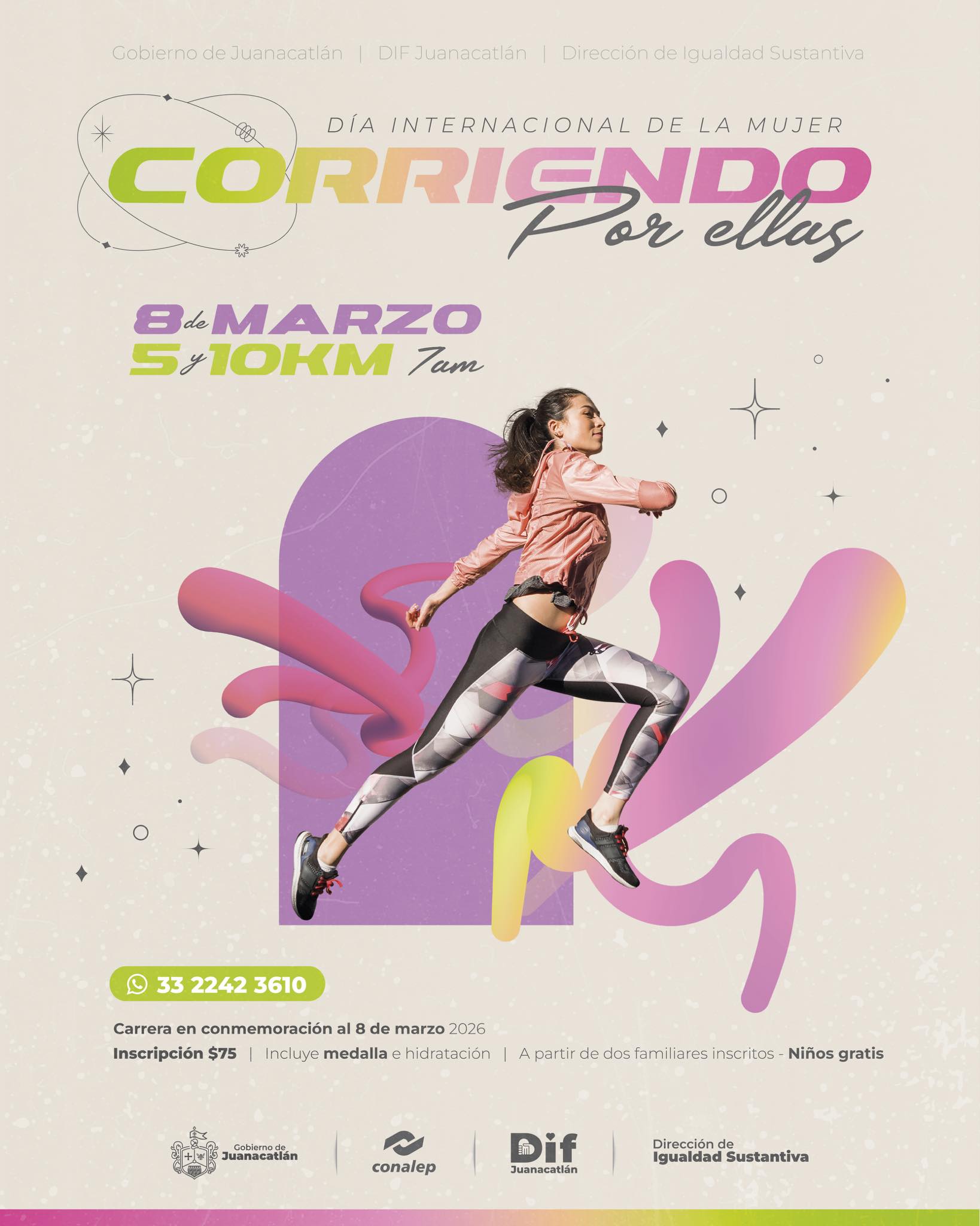 En el marco del Día Internacional de la Mujer, el Gobierno de Juanacatlán, a través del DIF Juanacatlán y la Dirección de Igualdad Sustantiva, te invitan a participar en la carrera “Corriendo por Ellas”.