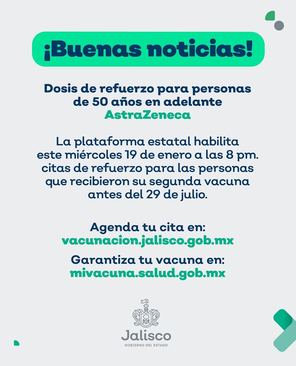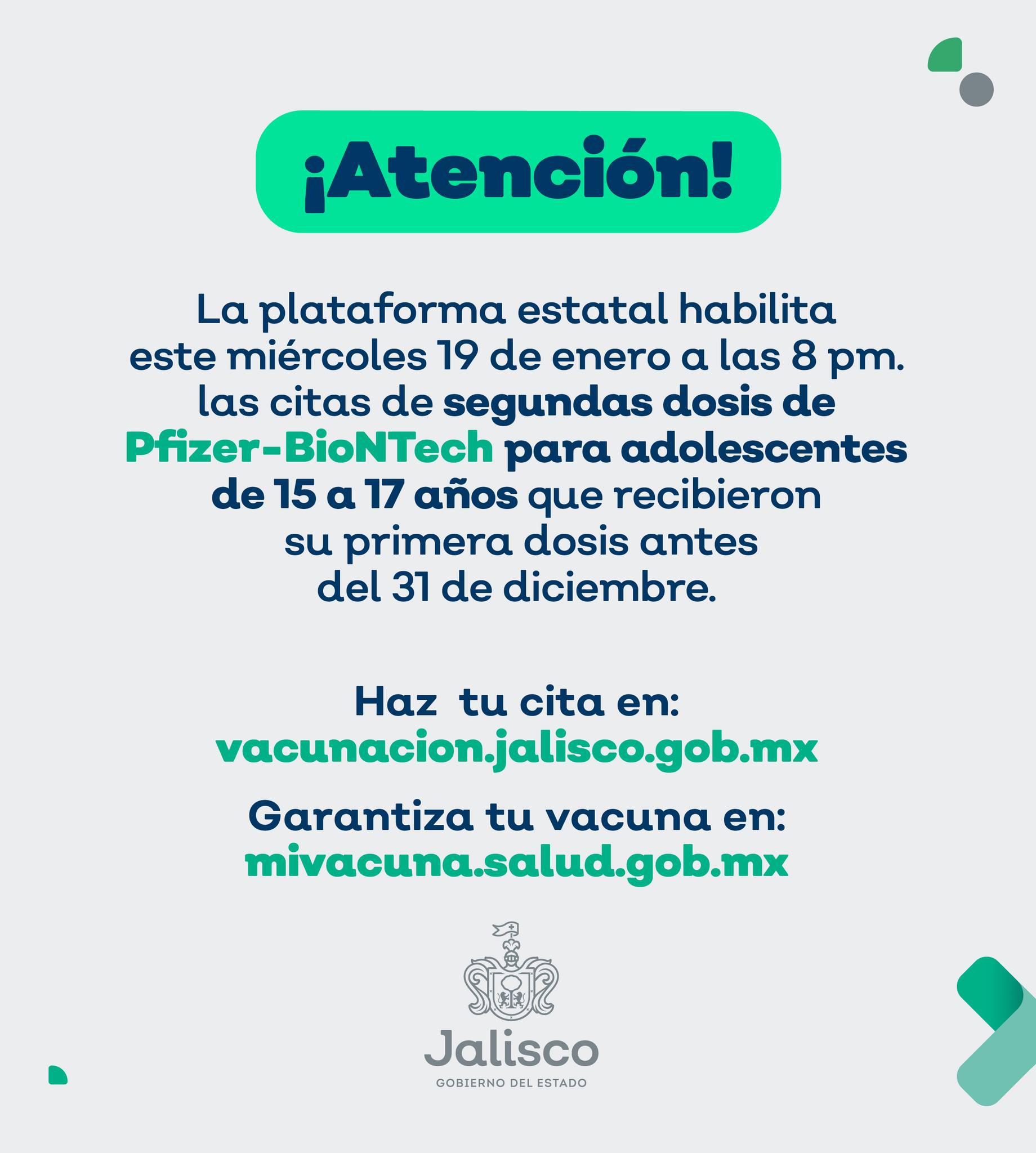 Este miércoles a las 8:00 pm se habilitará el sistema de citas para la vacunación de refuerzo contra COVID-19 a pobladores del Área Metropolitana de Guadalajara de 50 años y más, y para la segunda dosis de Pfizer BioNTech para jóvenes de 15 a 17 años.
