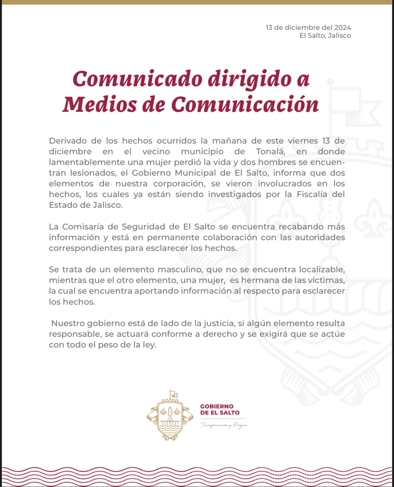 En un comunicado, tanto el Gobierno Municipal de El Salto como su alcaldesa, Nena Farías, confirmaron que elementos de la corporación están involucrados.