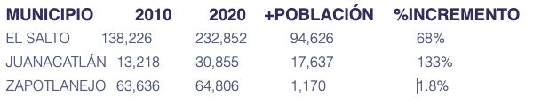 Por su parte, tomando en cuenta el mismo estudio y lapso de tiempo de 10 años, el municipio de El Salto aumentó de 138 mil 226 habitantes a 232 mil 852. Lo que significa un incremento del 68%.